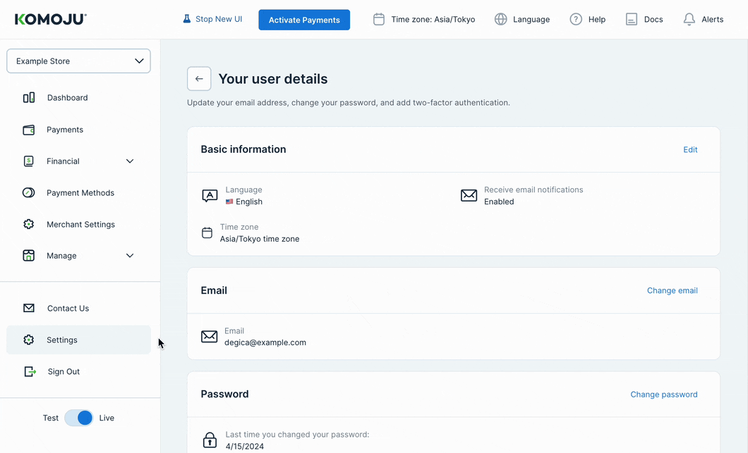 It is now possible to update your account information and user details from our consolidated Account Settings page, making management of your Komoju account faster and more intuitive than ever.
