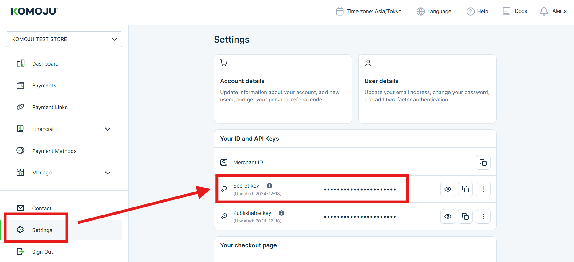 *Caution: When you check the "Secret Key", please make sure that your KOMOJU setting is Live mode.