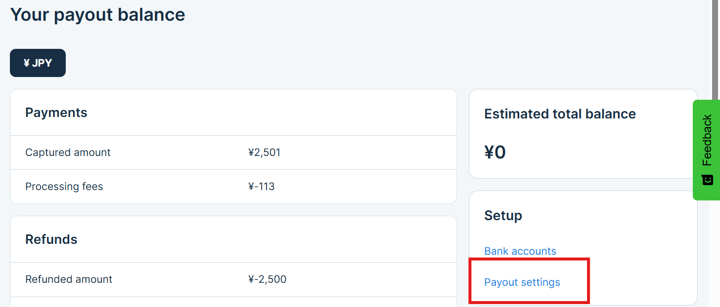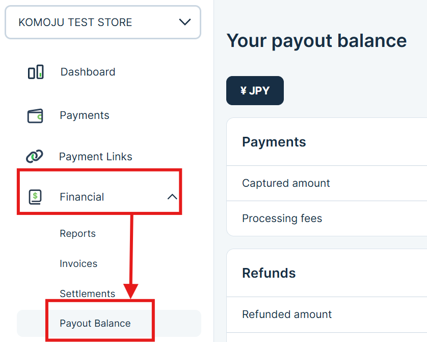 Step 1: Go to the KOMOJU Dashboard > Click “Financial” in the left menu > Click “Payout Balance”