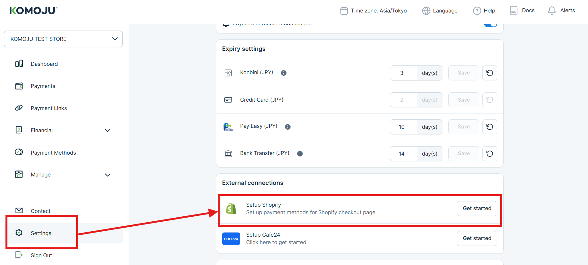 Login to KOMOJU and select ① [Settings], then ② [Click here to get started] under Setup Shopify.