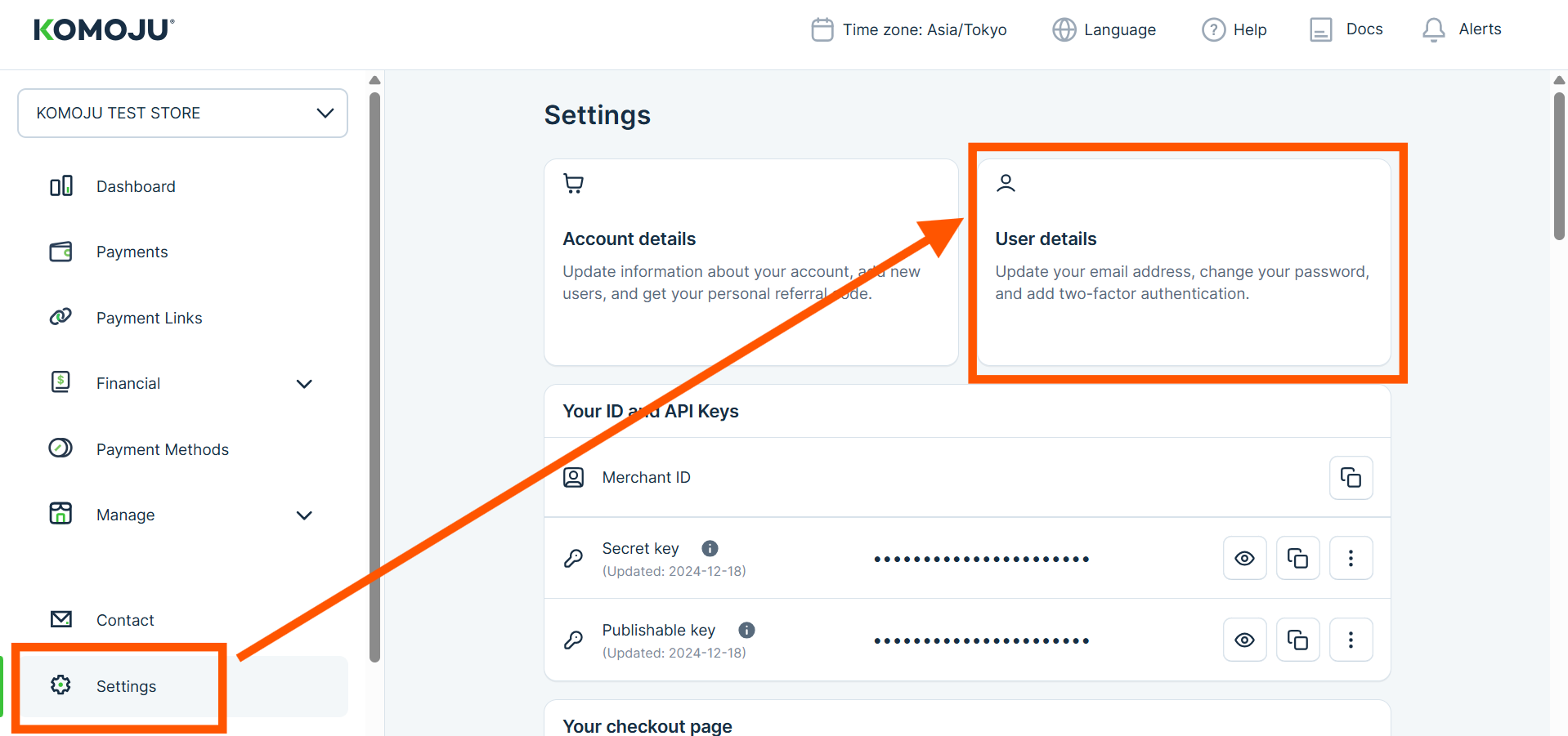 1. In the KOMOJU dashboard, go to Settings > User details.