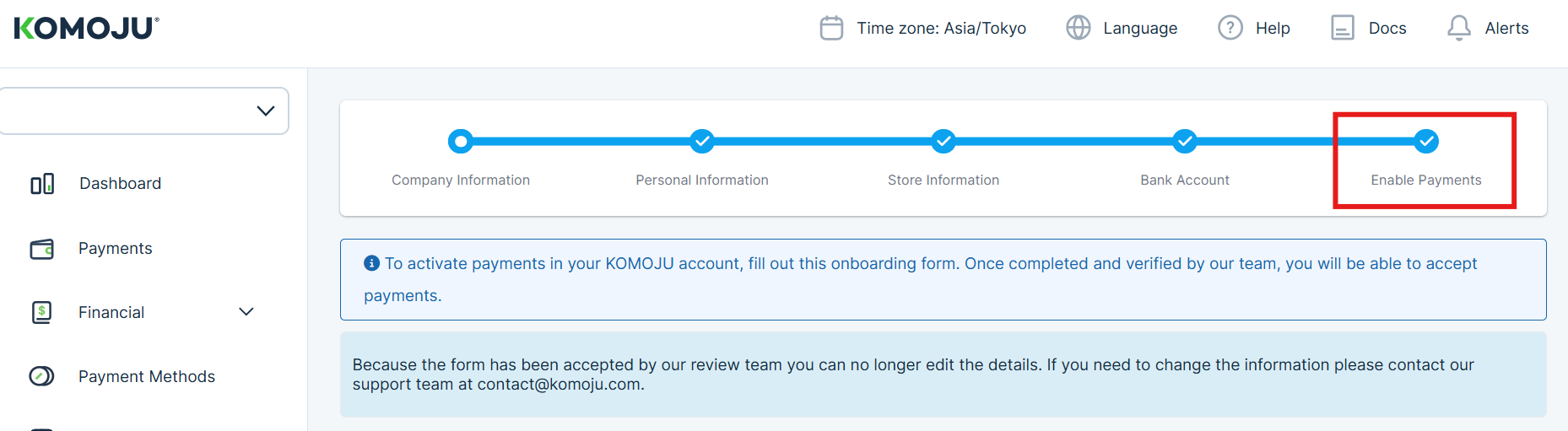 Step 1: Go to KOMOJU > Dashboard > Activate Payments