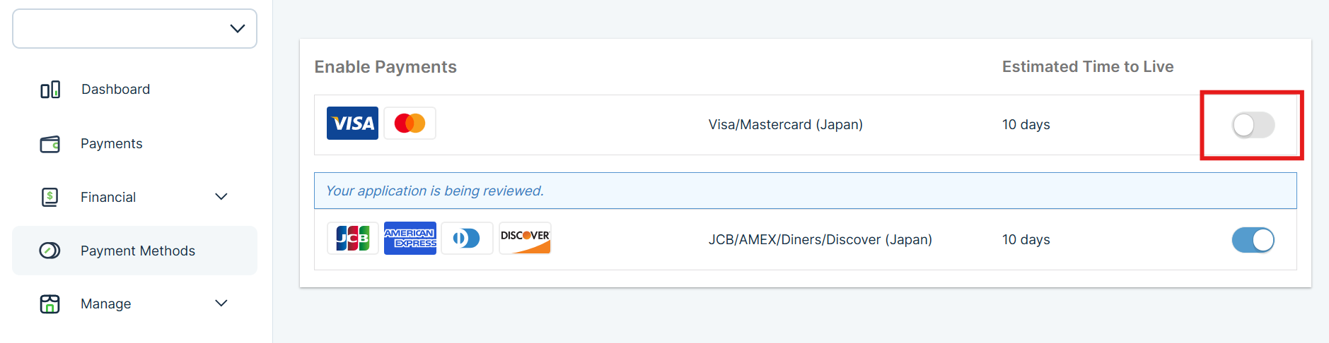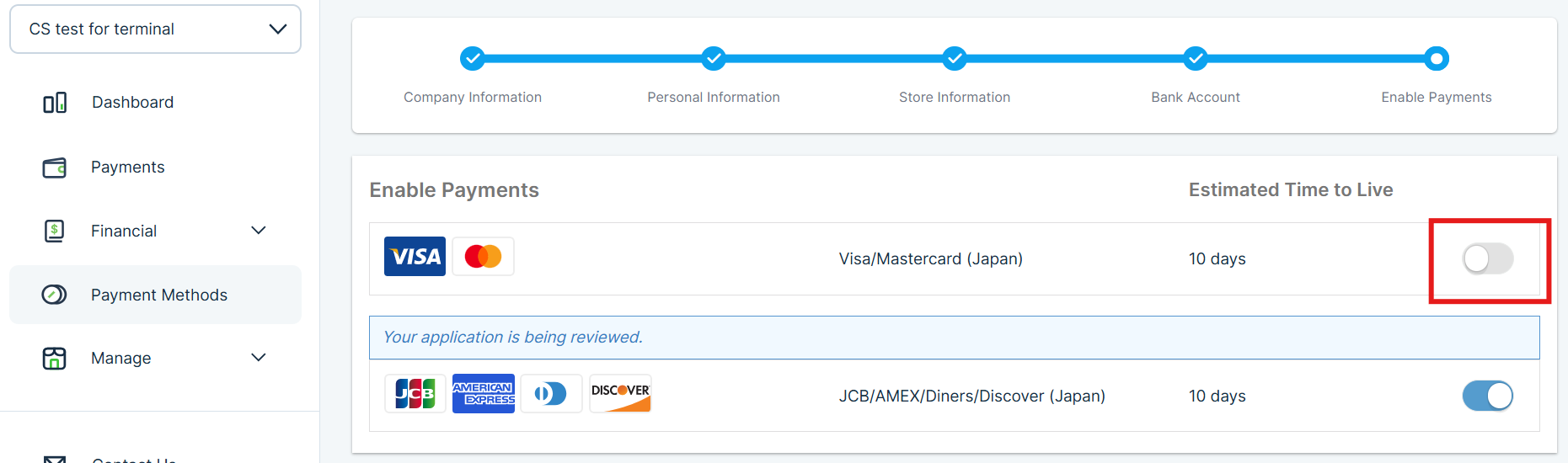 If your KOMOJU Terminal application is still under review and you wish to add payment methods, please click the "Start Payment" button in your dashboard.