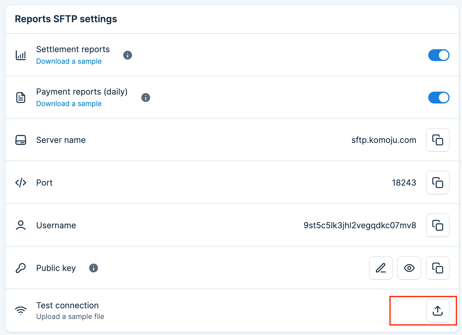 💡This function is intended for use when a merchant’s own system is reconciling transaction data. Through an SFTP server, it becomes possible to automatically and securely receive settlement reports and daily transaction reports.