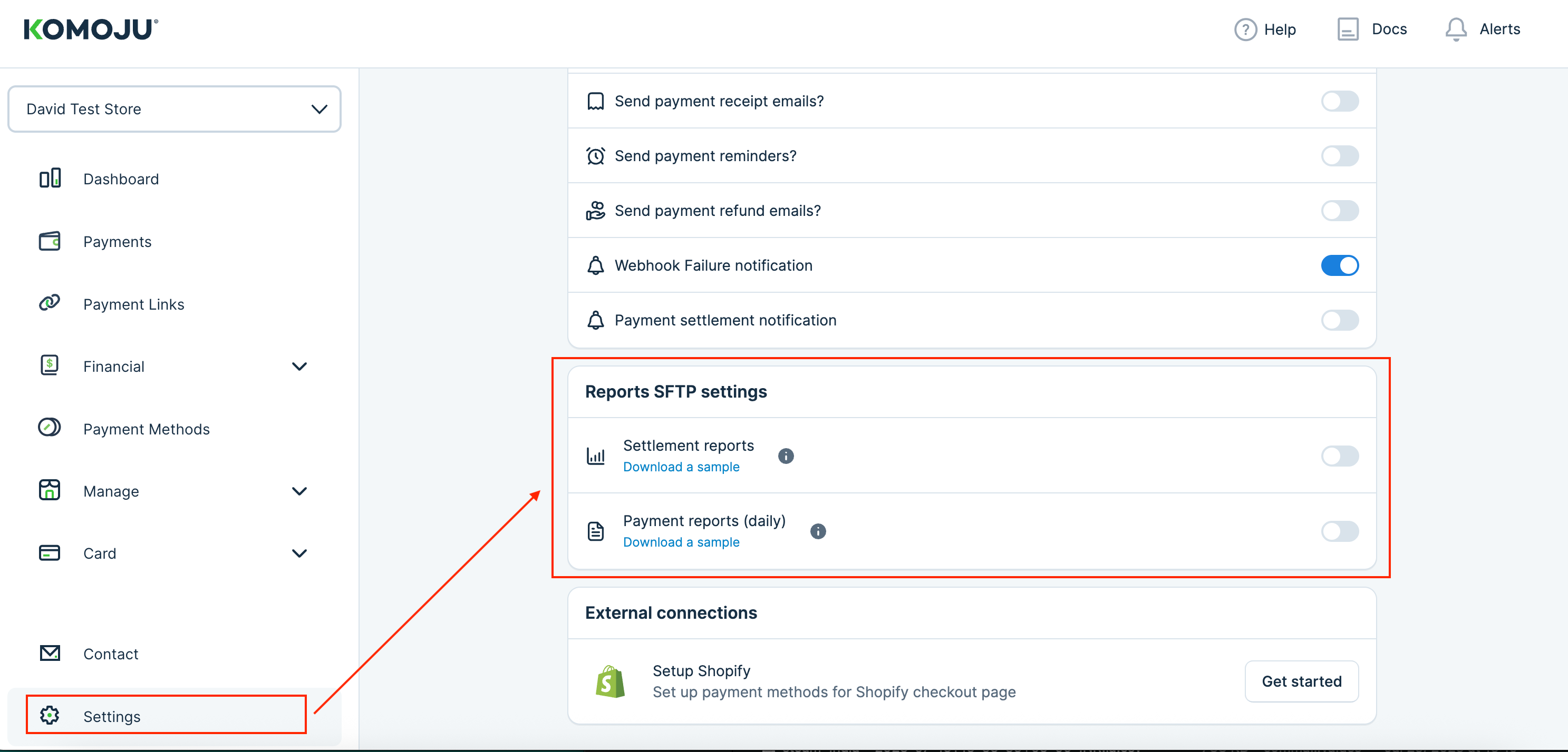 Step 2: Log in to KOMOJU and navigate to the Settings page. Locate the Reports SFTP Settings section.