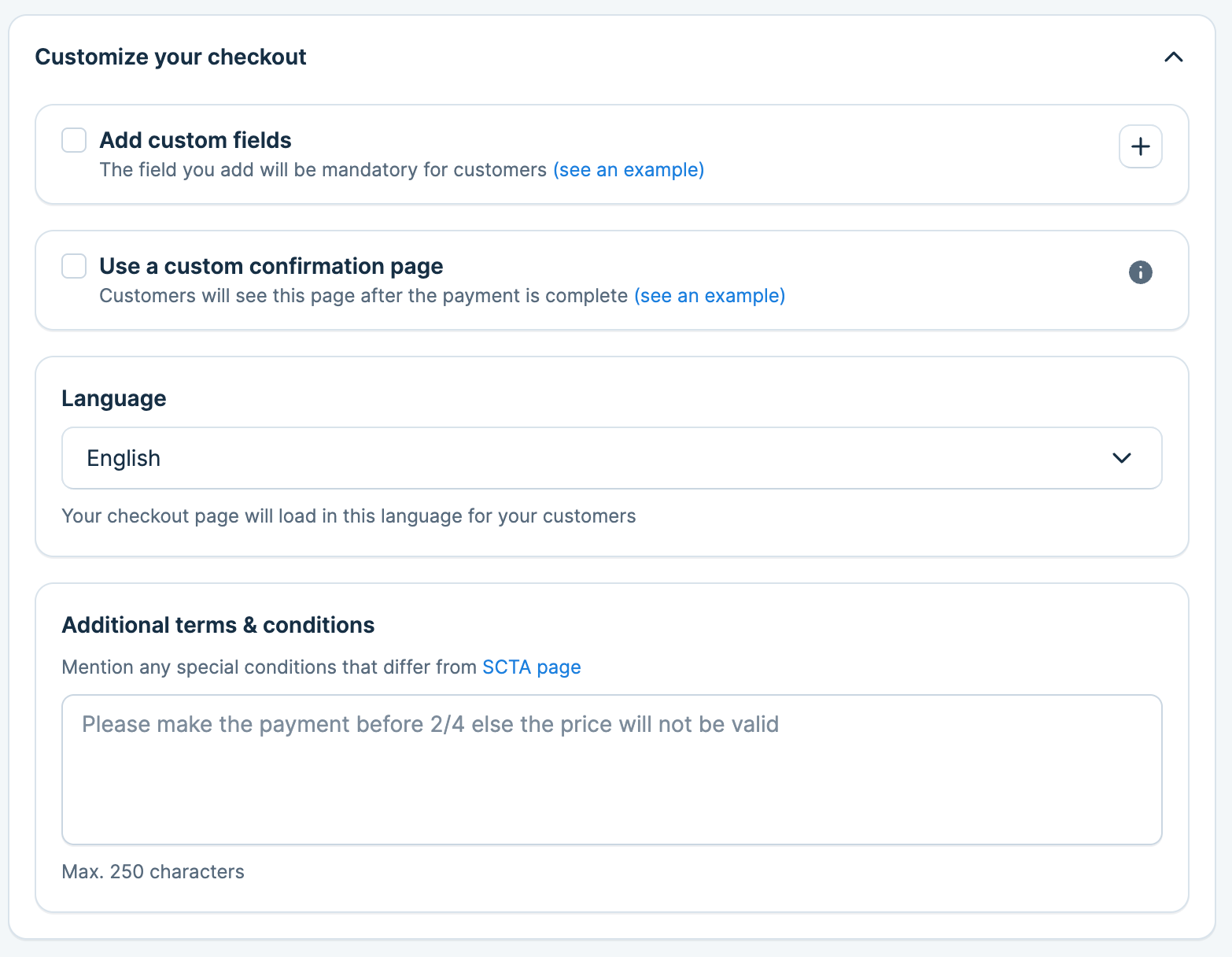 If specific information needs to be communicated to customers regarding a particular payment link and it is not already included in your SCTA page, you can add it here. Customers will see this information on the payment page.
