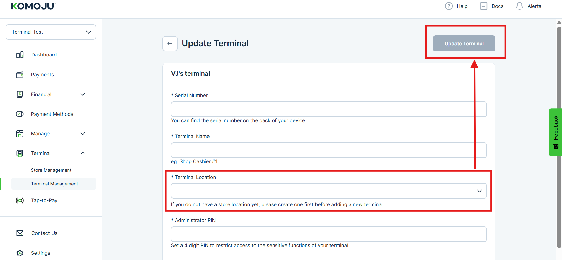 Step 5: Terminal Location > Select the new address from the dropdown > Click “Update Terminal”