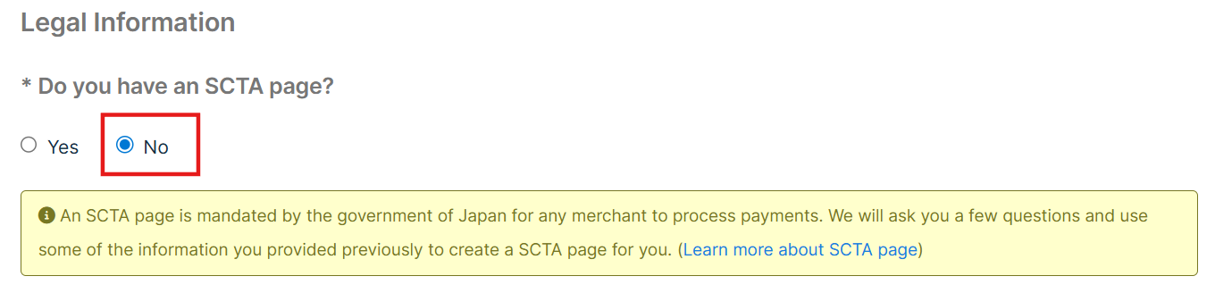 If you already have a page based on the Act on Specified Commercial Transactions, select “Yes” and enter the URL of the page.