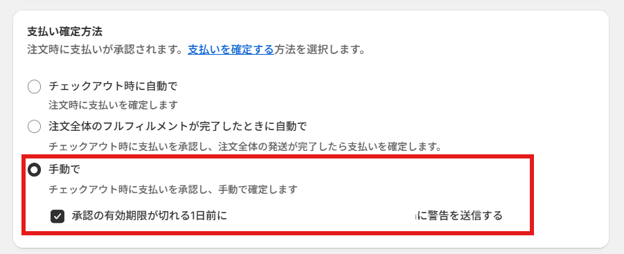 ステップ3:決済ページ内を下にスクロール>支払いの確定方法で「手動」を選択