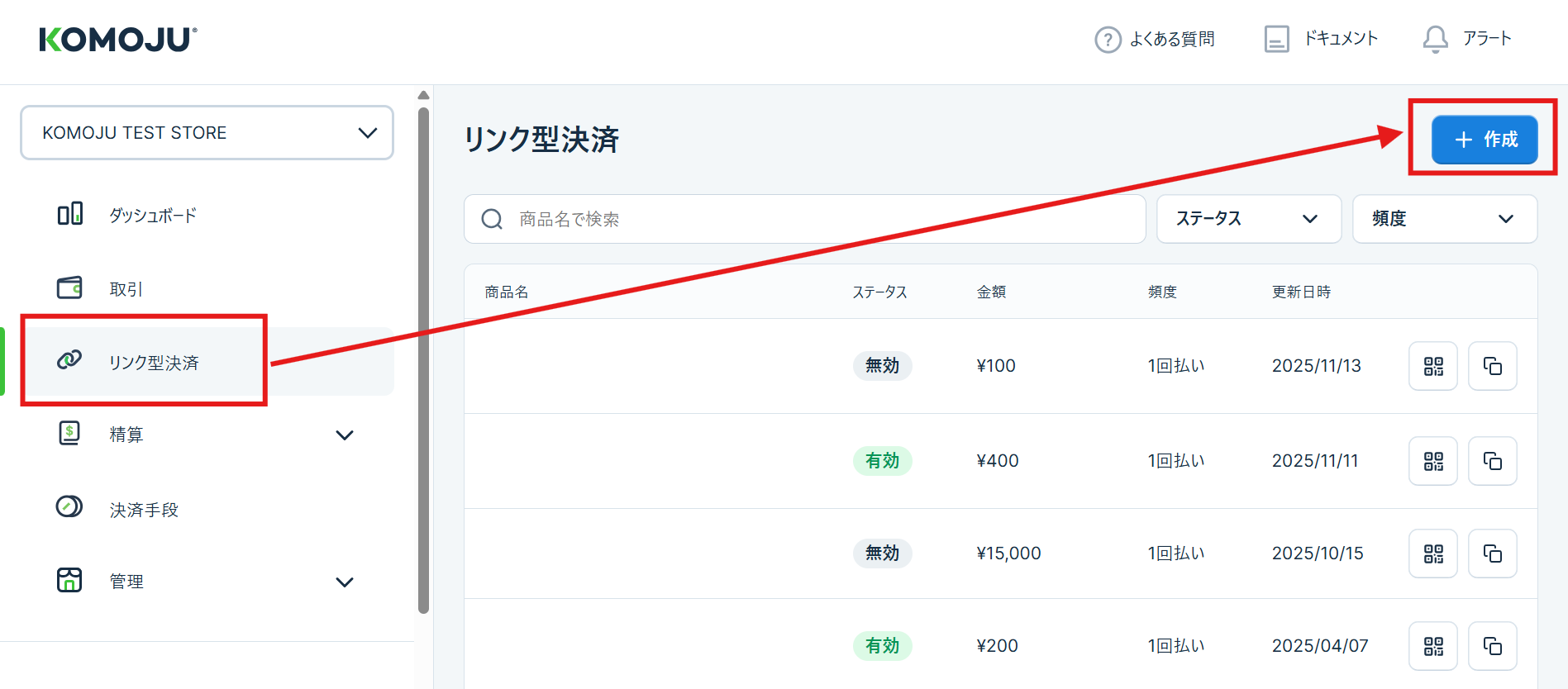 ステップ2:左メニューバーの”リンク型決済”をクリックし、作成を押下