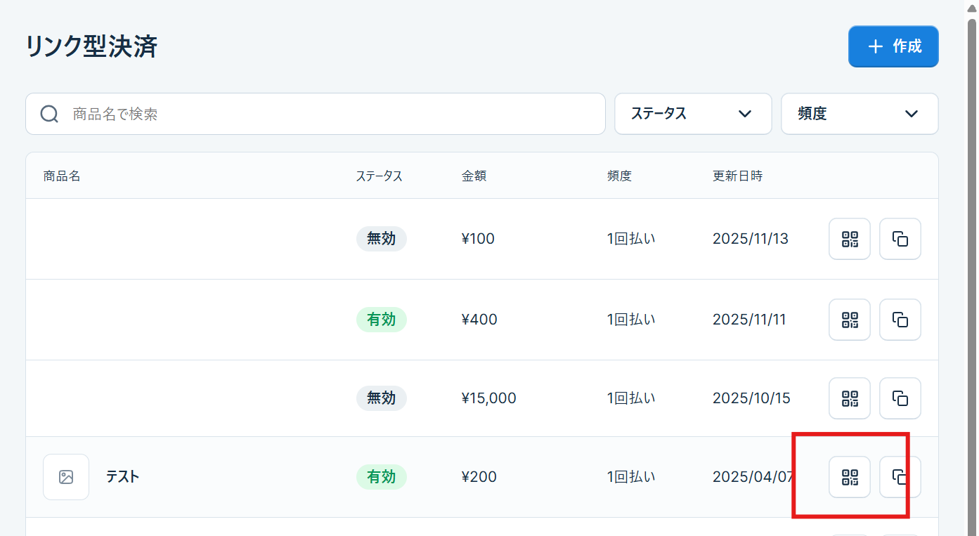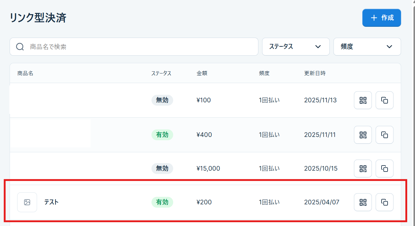 - ステータス: ステータスが “有効”となっている場合、 支払いの受付が可能な状態となります。ステータスが”無効”の場合、支払の受付が不可な状態です。