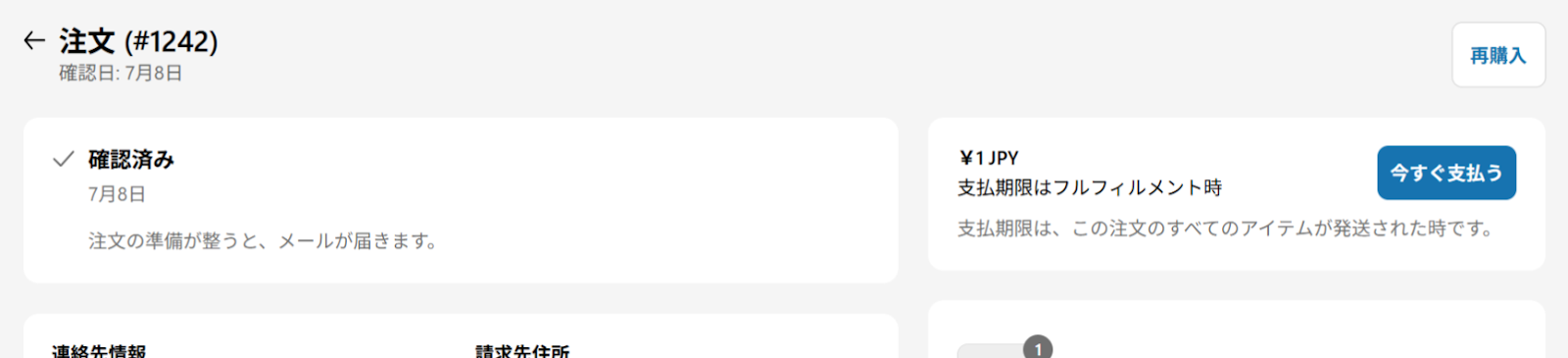 Shopifyにて【支払い確定方法】を「注文全体のフルフィルメントが完了したときに自動で」にしている場合、顧客へ送られるメールから注文情報を確認した際に以下のような【今すぐ支払う】ボタンが表示されます。