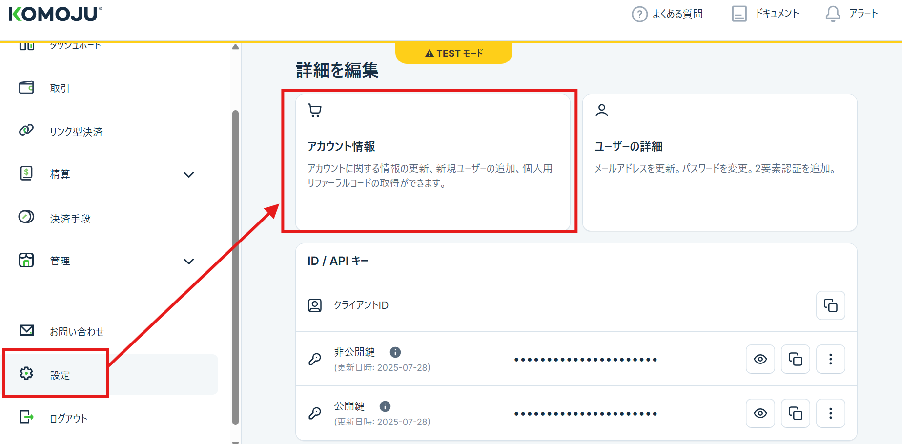 ステップ1:KOMOJU管理画面>設定