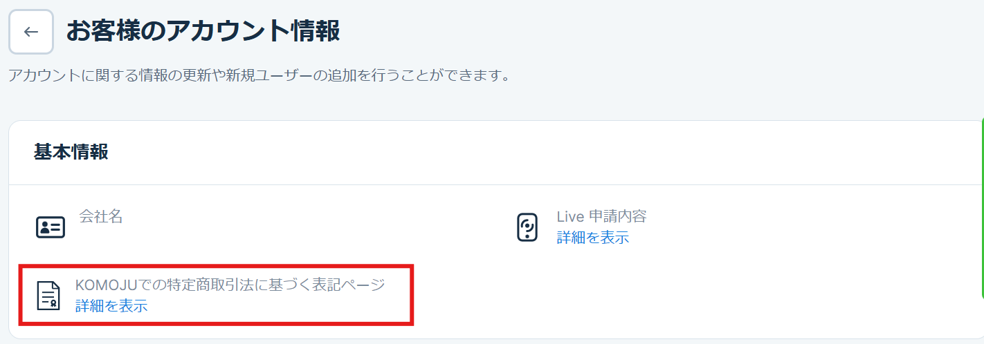 ステップ2:アカウント情報>KOMOJUでの特定商取引法に基づく表記ページ