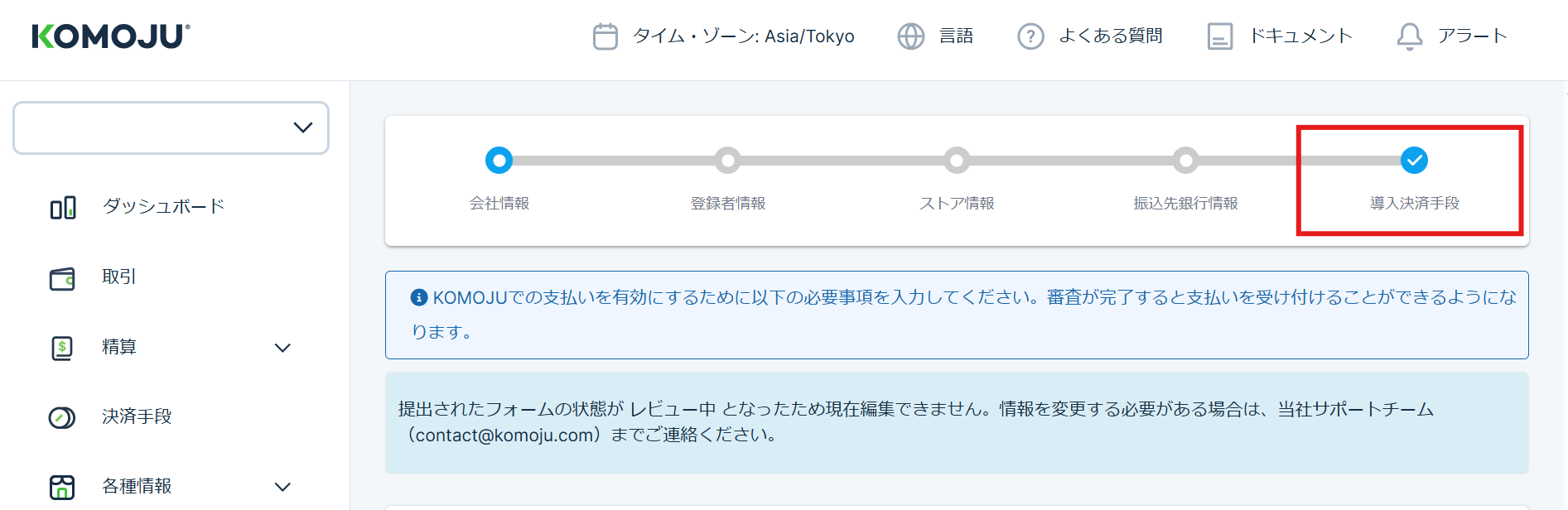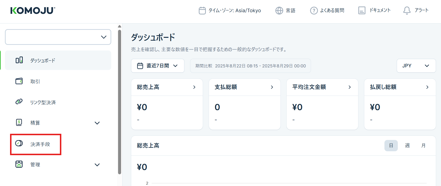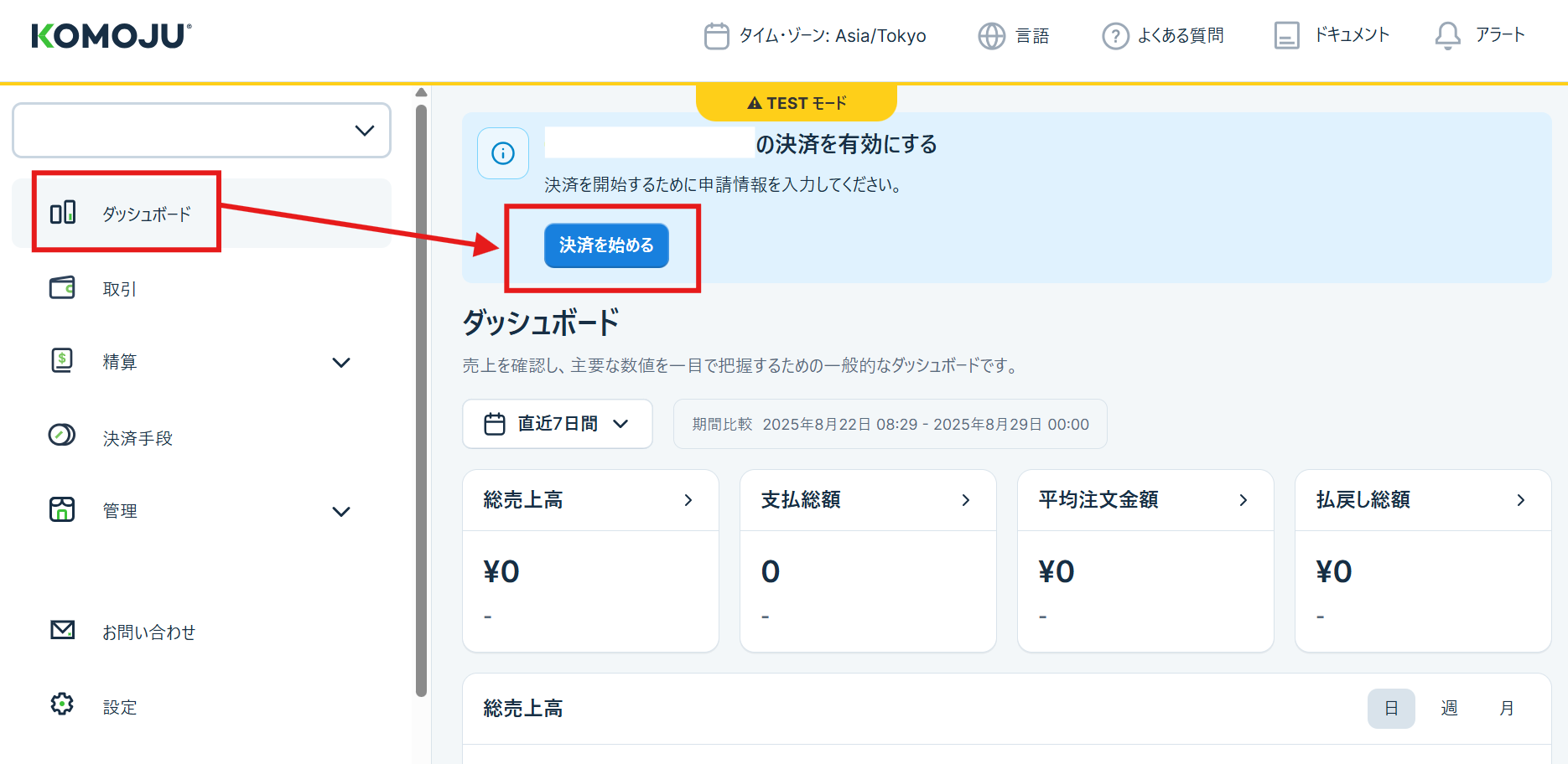 1:KOMOJU>ダッシュボード>「決済を始める」を選択