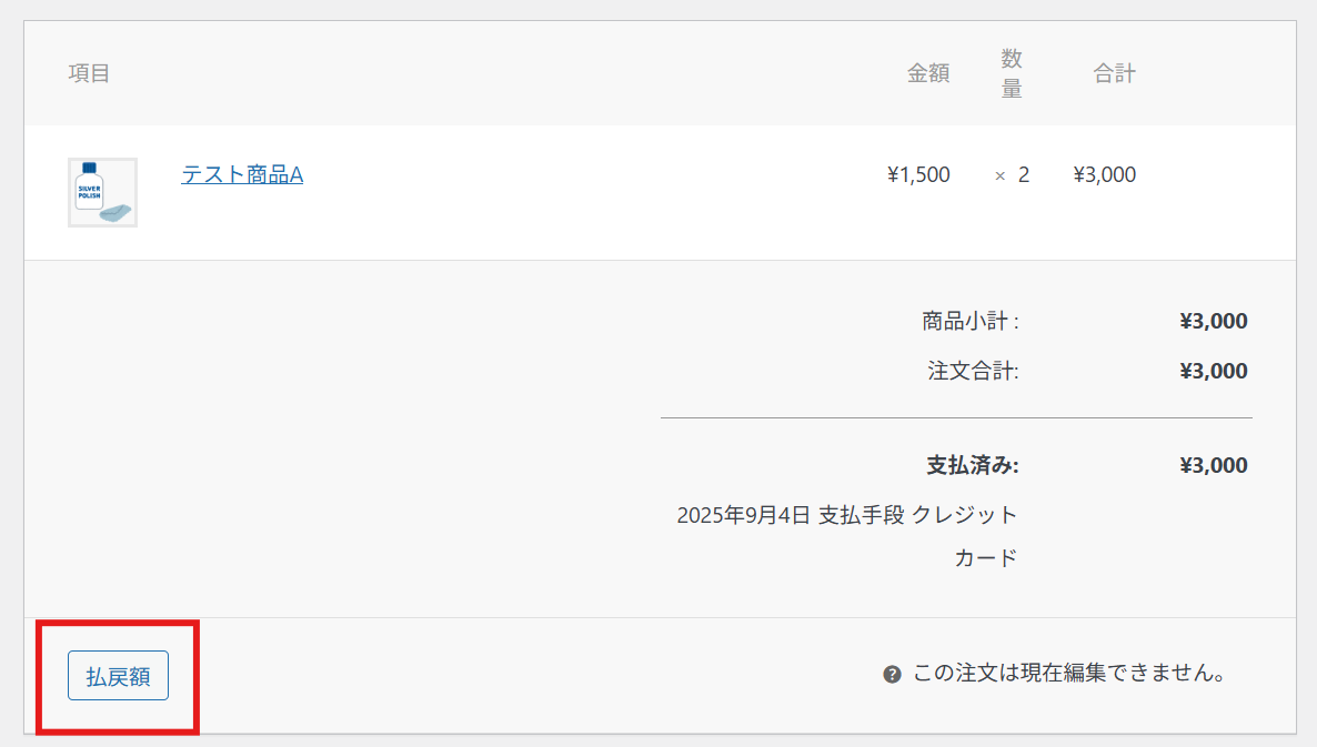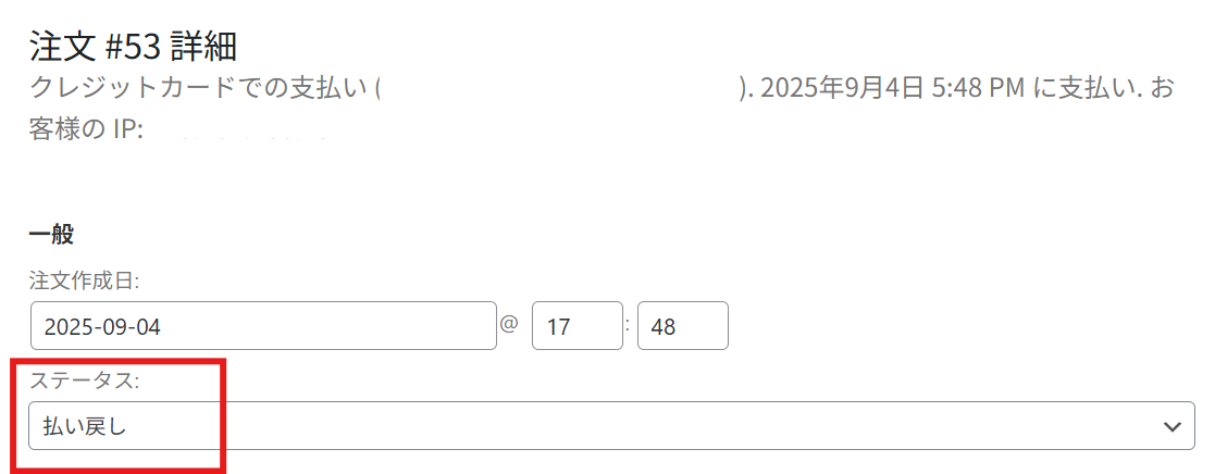 - 返金処理は上記の通りWooComemrceの所定のボタンから返金をお願いいたします。