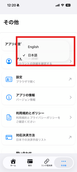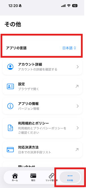 ステップ1:モバイルアプリにログイン > その他 > アプリの言語