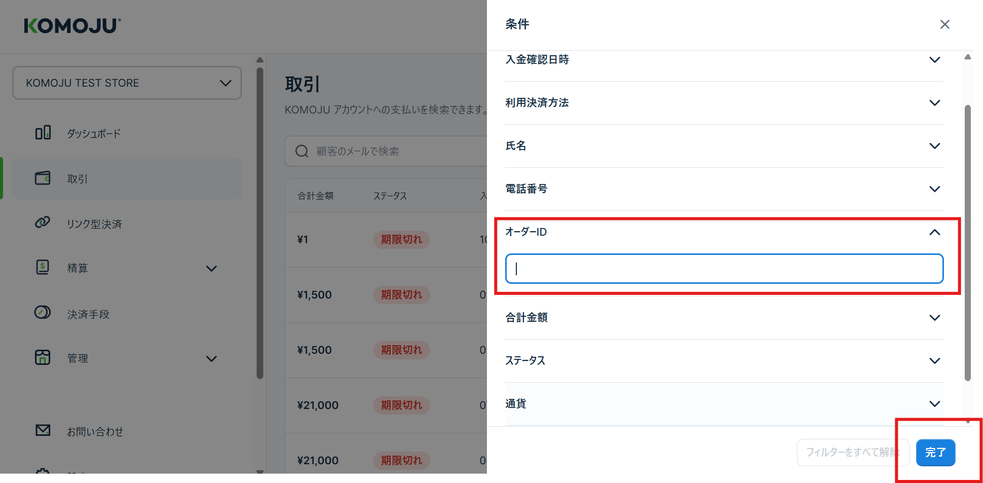 【タッチ型決済】KOMOJUオーダーIDの確認方法 2025年10月17日 00:22 更新 Tap to PayアプリでKOMOJUオーダーIDを確認する方法KOMOJUの管理画面でお取引内容をご確認いただく際は、Tap to Pay上に表示されるレシート番号がKOMOJUオーダーIDとなります。ステップ1:Tap to Payアプリへログイン > 履歴をクリックステップ2:該当取引をクリック > レシート番号をコピーステップ3:KOMOJU管理画面 > 取引 > 詳細条件をクリックステップ4:ステップ2で取得したレシート番号をオーダーID箇所にペースト > 完了をクリック 関連記事 【タッチ型決済】タッチ型決済について 【タッチ型決済】ご利用方法 【タッチ型決済】トラブルが発生した際の対処法 【KOMOJUアプリ】アプリの機能と設定について 入金スケジュール確認・変更方法