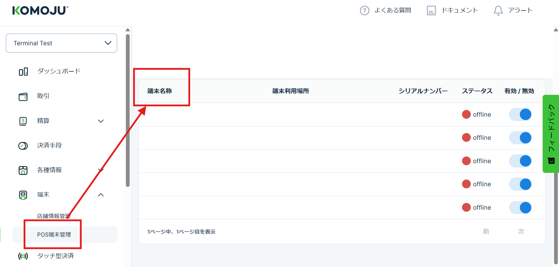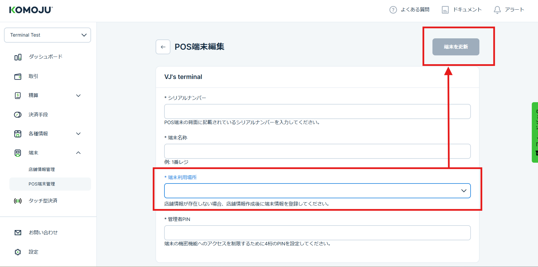 【ターミナル】端末住所の変更方法 2025年11月25日 03:37 以下の手順で端末に紐づく店舗(住所)を変更できます。ステップ1:KOMOJU管理画面 > 端末 > 店舗情報管理ステップ2:新しい住所で 店舗を追加 します。ステップ3:KOMOJU管理画面 > 端末 > POS端末管理ステップ4:住所を変更したい 端末を開く > 編集ステップ5:端末利用場所 > プルダウンからご希望の住所選択 >端末を更新をクリック 関連記事 【KOMOJUアプリ】ご利用について 決済を追加申請する方法 2023/5/31 「レポート」より抽出されるCSVファイルの項目が追加されます 登録情報の確認方法